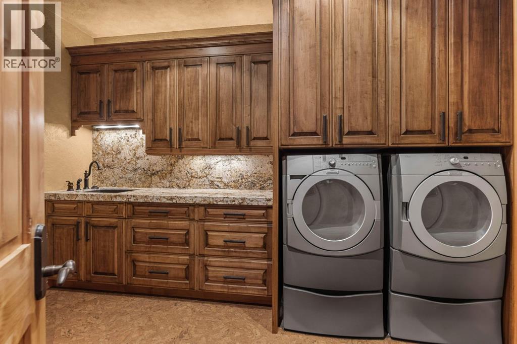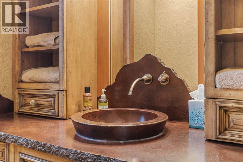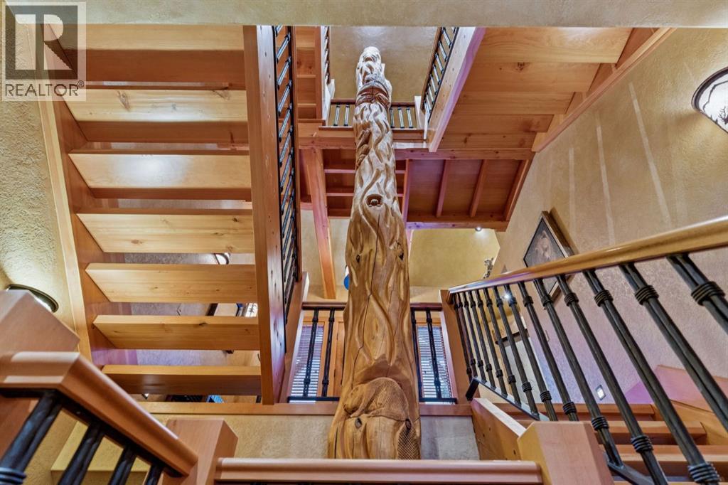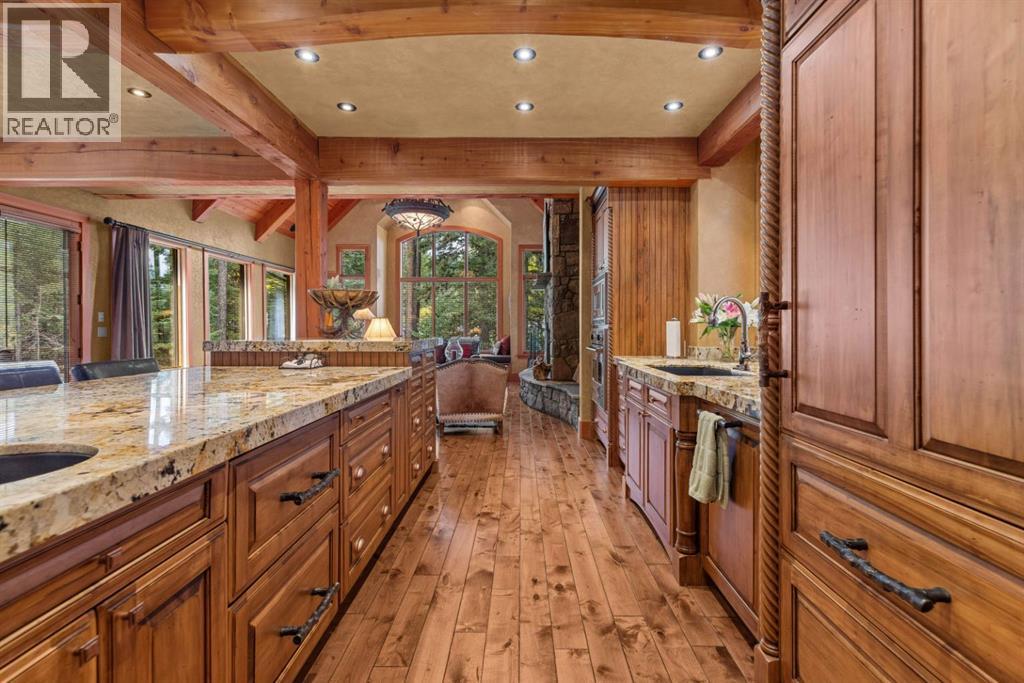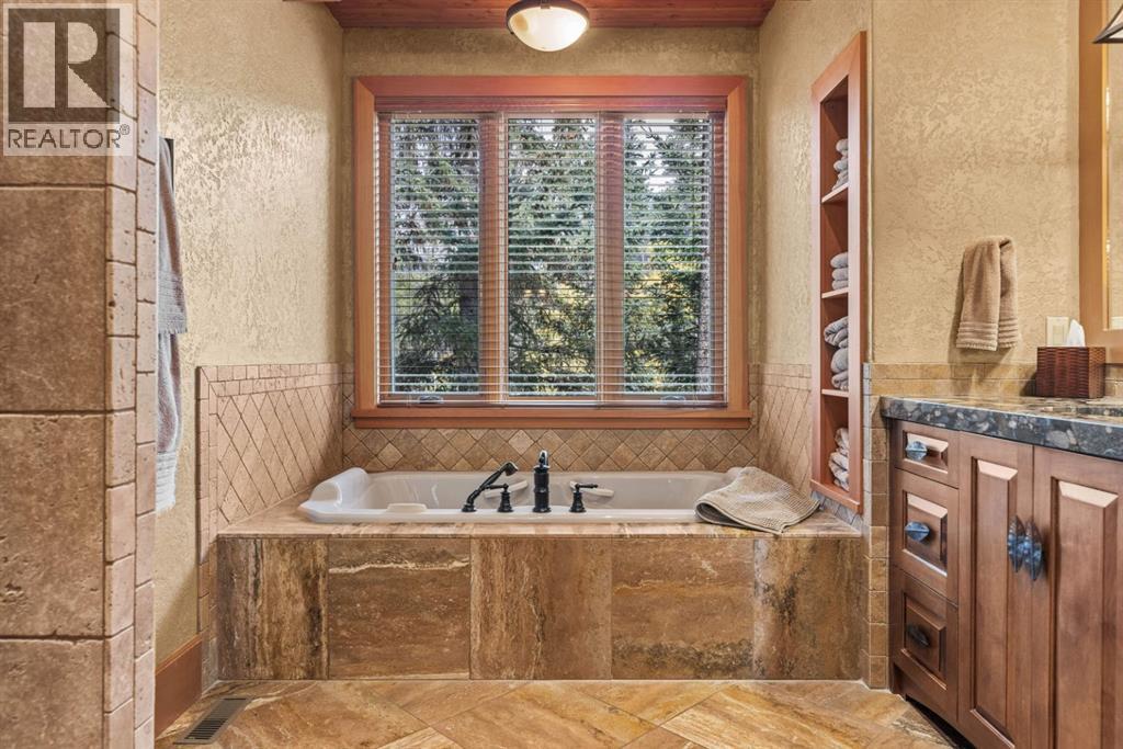 Located in Cairns on the Bow, just minutes from the gates of Banff National Park, this custom 4,000+ sq ft timber-frame residence offers a rare blend of privacy, warmth, and mountain character. Set on a beautifully treed 17,642 sq ft lot within Canmore’s only gated community, the home combines natural seclusion with exceptional craftsmanship.Inside, soaring fir-paneled ceilings and the timeless elegance of Italian plaster set a warm and sophisticated tone throughout. The open-concept layout seamlessly connects the principal living spaces, ideal for both intimate family moments and grand entertaining. The great room is anchored by a striking Rundle stone wood-burning fireplace, creating a natural gathering space that radiates warmth and character. The kitchen pairs custom cabinetry with Sub-Zero and Viking appliances, thoughtfully designed for everyday living and effortless entertaining. The primary suite offers a peaceful retreat with treetop views and a spa-inspired ensuite finished in Marinace granite and travertine, complete with a jetted tub.Additional highlights include two spacious guest bedrooms, a home theatre, a versatile recreation room, a dedicated home office, and a custom bar — offering flexibility for family and guests alike. Outdoors, professionally landscaped grounds feature natural stonework, a built-in BBQ, and a cozy fire pit, creating the perfect setting for year-round mountain living.A rare opportunity to own a timeless timber-frame home in Cairns on the Bow, where privacy, nature, and thoughtful design come together in perfect harmony. https://163cairns.info/ (id:6769)