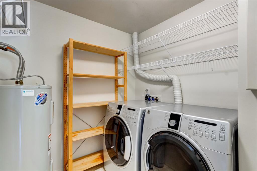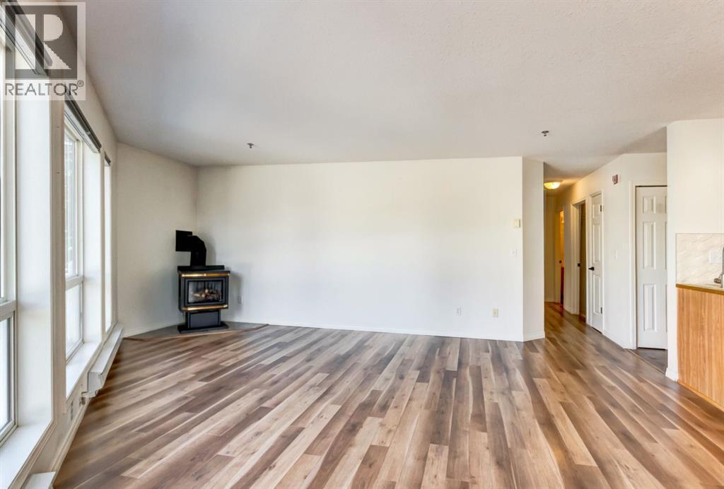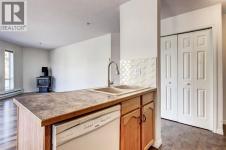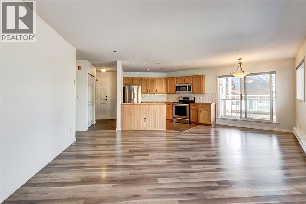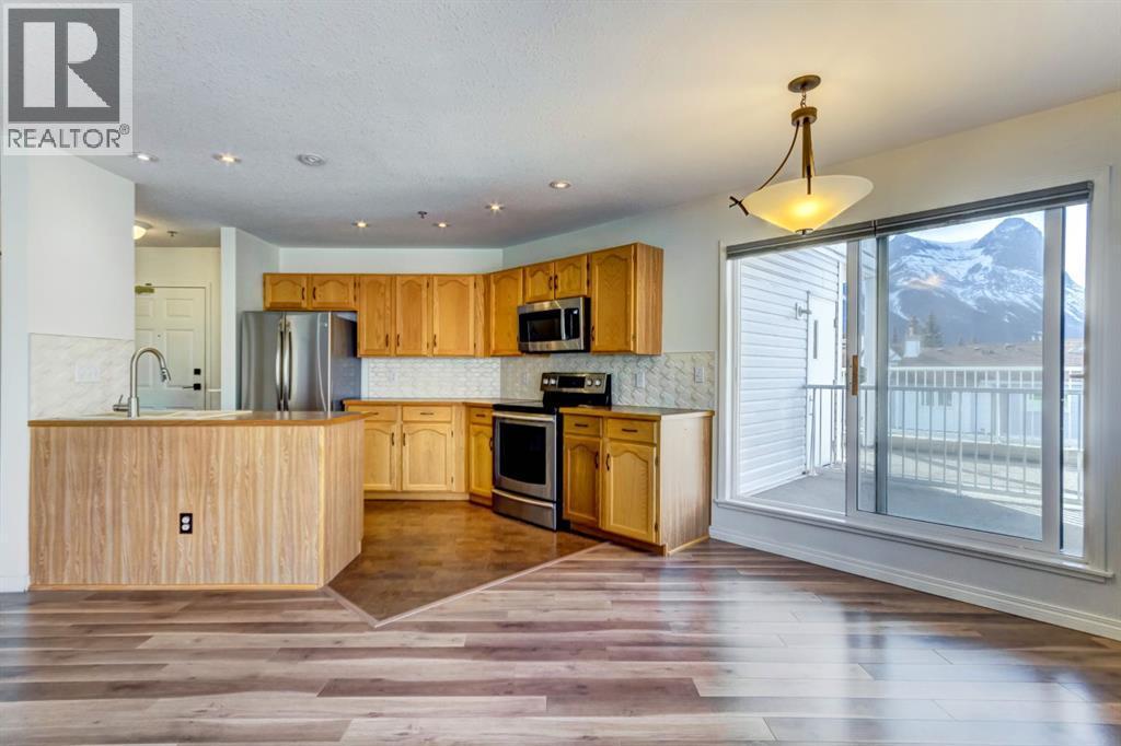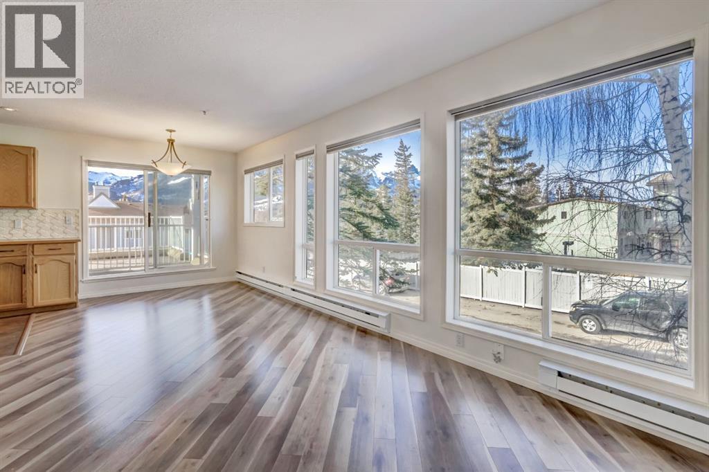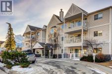 Two bedroom apartment with amazing views. This bright two bedroom, two bathroom corner suite offers over 980 sqft of single level living, perfectly positioned to capture breathtaking mountain views. Oversized windows and the coveted corner location flood the home with natural light, while its sunny valley side setting enhances the warm, inviting atmosphere. The open concept kitchen, dining and living area is ideal for both everyday living and entertaining, anchored by a cozy fireplace. Step outside to the spacious private patio, an extension of the living space and the perfect spot to relax and take in the surrounding alpine scenery. The primary bedroom features a walk in closet and private ensuite, while a second bedroom, full bathroom, walk-in laundry room and ample storage complete the layout. Residents enjoy excellent on site amenities, including an outdoor hot tub, a common gathering space, underground parking and storage. Located just steps from hiking and biking trails plus numerous Bow Valley attractions. (id:6769)