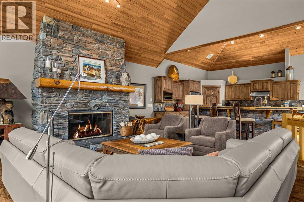 Set within the exclusive enclave of Hubman Landing, this 5-bedroom, 5-bathroom residence offers over 4,100 sq ft of living space, thoughtfully positioned to capture exceptional views from nearly every window. Elevated above the surrounding trees and backing onto privacy, the home embraces its natural setting with multiple outdoor patios and balconies designed to take full advantage of the landscape. The main level is anchored by vaulted ceilings and warm hardwood flooring, creating a timeless Canmore aesthetic. The kitchen is both functional and inviting, opening into generous living and dining spaces that frame the mountains beyond. The primary suite is conveniently located on the main floor for true one-level living and features a striking floor-to-ceiling fireplace, creating a dramatic focal point while maintaining a sense of comfort and retreat.The walkout lower level provides additional living space with separation between levels, ideal for guests, family, or multi-generational living. With five bedrooms and five bathrooms in total, the layout offers flexibility without compromising privacy. A tranquil backyard with a flagstone patio and fire pit, surrounded by mature trees, offers a private outdoor retreat that complements the home’s elevated setting. A double-car garage, expansive square footage, and a setting that combines elevation, views, and seclusion make this a rare opportunity in one of Canmore’s most sought-after communities. (id:6769)