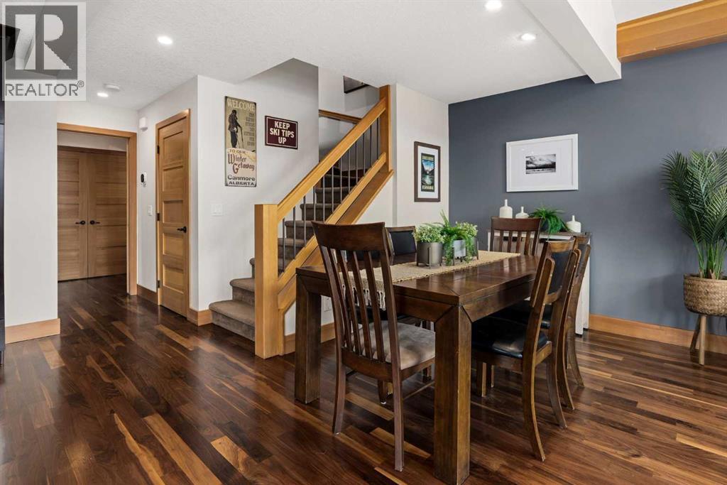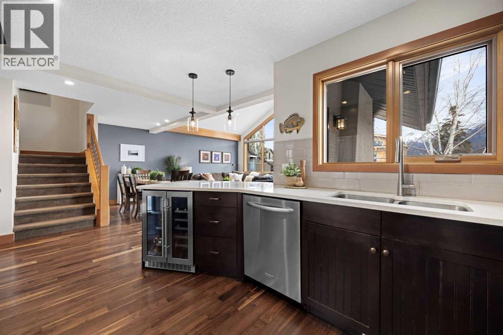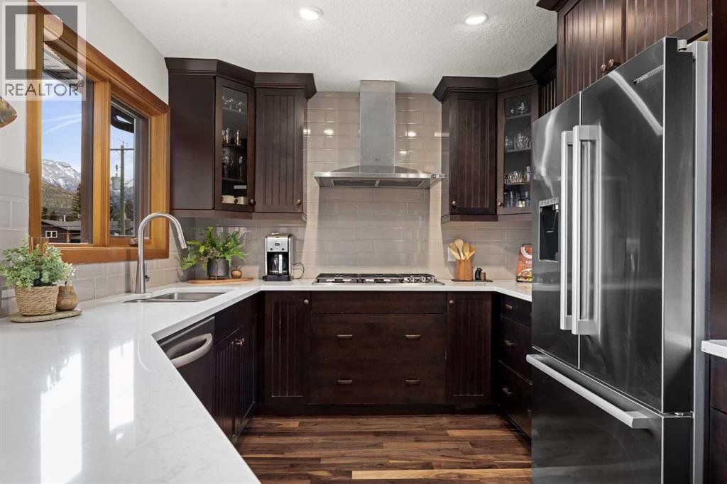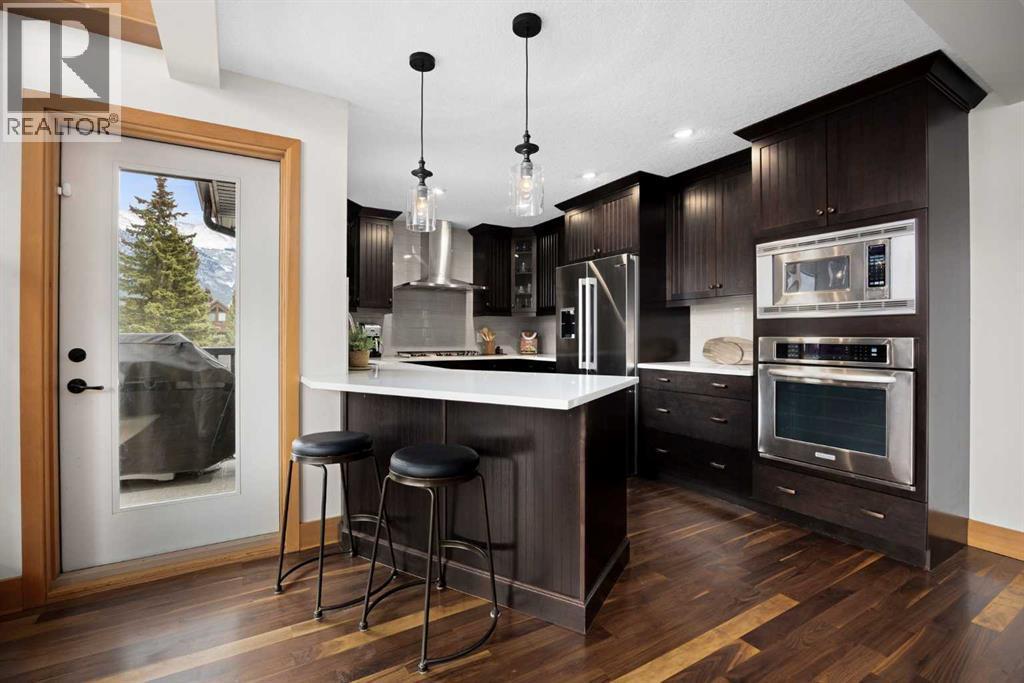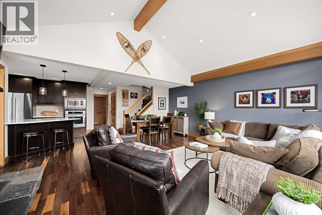 If you've been searching for the idyllic Canmore vacation property or a full-time mountain home that truly has it all, your search ends here. Nestled in the heart of South Canmore just a short walk from Main Street and the river valley, this 3-bedroom, 4-bathroom townhome is one of the finest examples of mountain residential craftsmanship you will find in the Bow Valley.Masterfully built by Fournier Construction, the interior is timeless and elegantly finished throughout. Rich Douglas Fir trim and doors, pristine Walnut hardwood floors, and a heated tile foyer set the tone from the moment you step inside. The dream living room commands your attention with soaring vaulted ceilings centered by a bold Rundle Stone fireplace, oversized view windows that frame the mountains in every direction, and a large wrap-around sundeck that invites you outside to take it all in.The kitchen is appointed with stainless steel appliances, a gas countertop range, and a built-in oven, bar fridge and wine bar, newly installed Quartz countertops, designed for those who love to cook and entertain. A convenient half bath rounds out the main level as well as a private master suite with ensuite. Upstairs, you will find two generous bedrooms each with their own ensuite, plus the added convenience of upper floor laundry. All bedrooms are complete with ensuites ensuring every guest has their own private retreat.With over 1,600 sq ft of meticulously maintained living space, a single car garage, and a spacious entryway, this property shows like new from top to bottom. You will not find a better maintained home in Canmore. Properties of this caliber, in this location, rarely come to market. Reasonable condo fees of $306/monthly and a healthy condo corporation round out your lifestyle investment in Canmore. (id:6769)