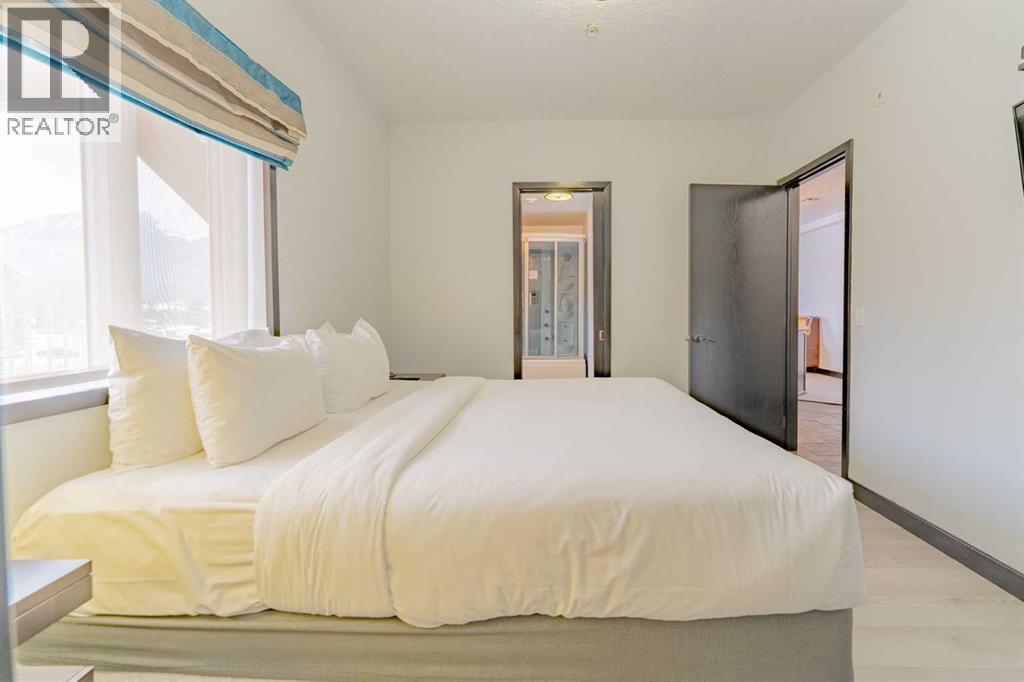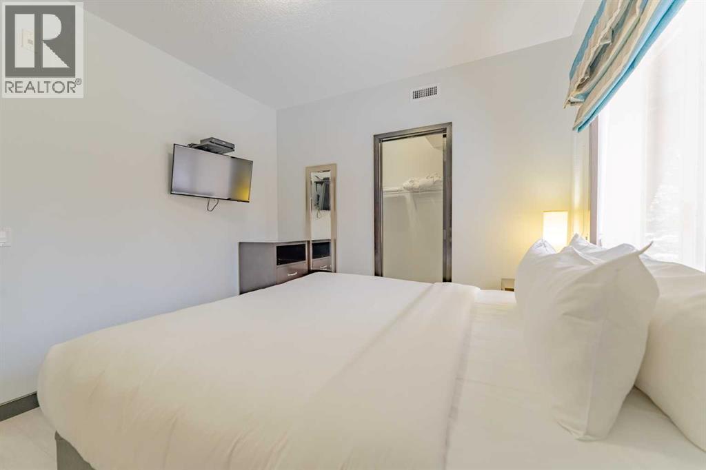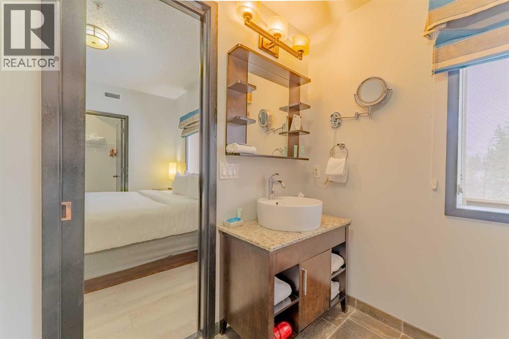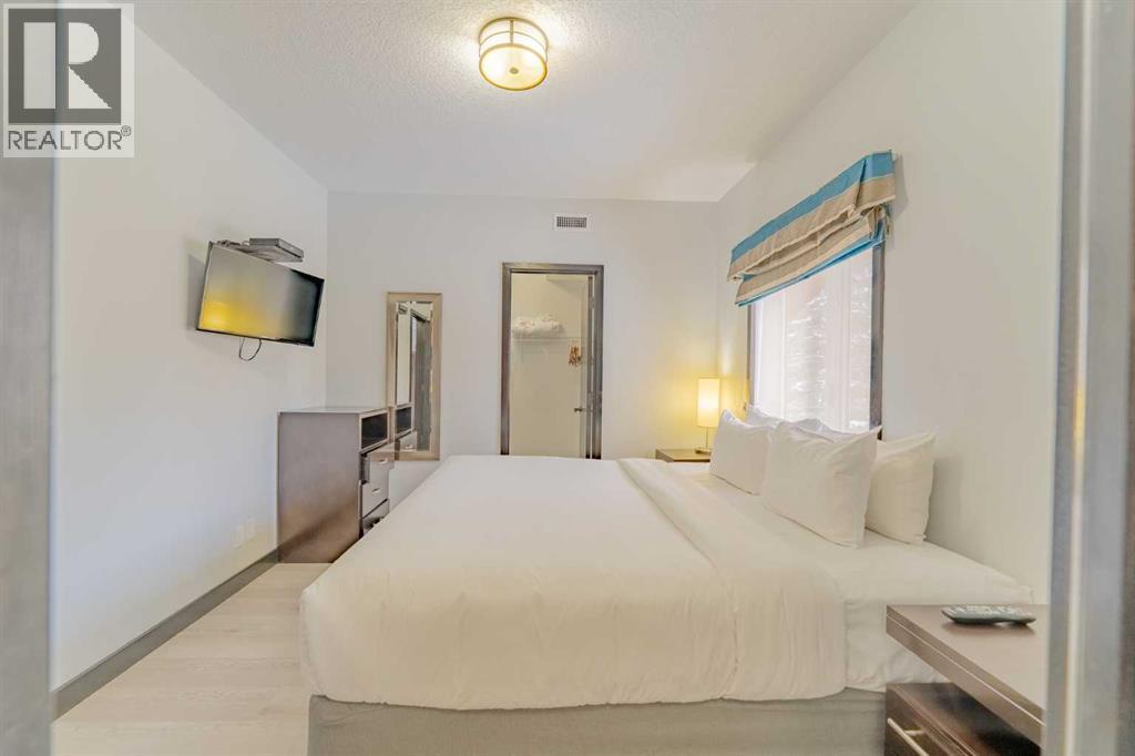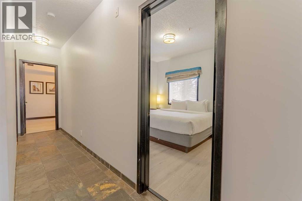 This corner unit at Grande Rockies puts you right in the middle of Canmore’s short-term rental market in an amenities-rich building and an ideal, walkable location. With 908 square feet, two bedrooms and two full bathrooms, it’s a perfect setup for guests and owners alike.The unit is fully turnkey, with a stocked kitchen, an open living space, a gas fireplace, and a private deck facing south and east. That corner exposure makes a noticeable difference. You get more natural light throughout the day and wide views toward the Three Sisters and surrounding ranges. The layout is practical and easy to maintain, which is key when you’re running a rental. This suite is currently part of the in-house rental program, but you have the option to switch to self-management or another provider depending on how hands-on you'd like to be.Grande Rockies has some of the best amenities in town, which helps keep it competitive year-round. Guests and owners have access to a large indoor pool with a waterslide, an indoor/outdoor hot tub, a spacious fitness centre, and an on-site restaurant. The common areas are well-kept and designed with short-term stays in mind.Location is another strong point. You’re a short walk to downtown shops, restaurants, and trails, and about 20 minutes from Banff. One titled underground parking stall is included. GST is included in the list price. Buyers should consult their accountant regarding eligibility for GST deferral. If you’ve been looking for a simple and smart way to enter Canmore’s short-term rental market, this is an excellent option with great positioning. (id:6769)