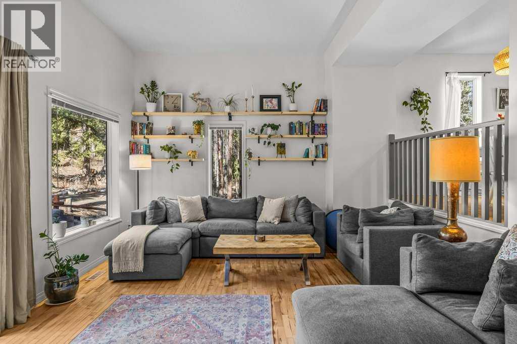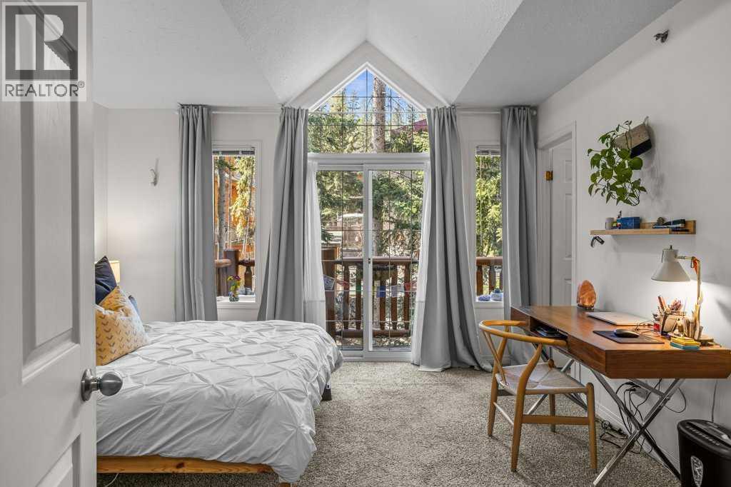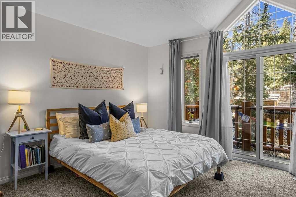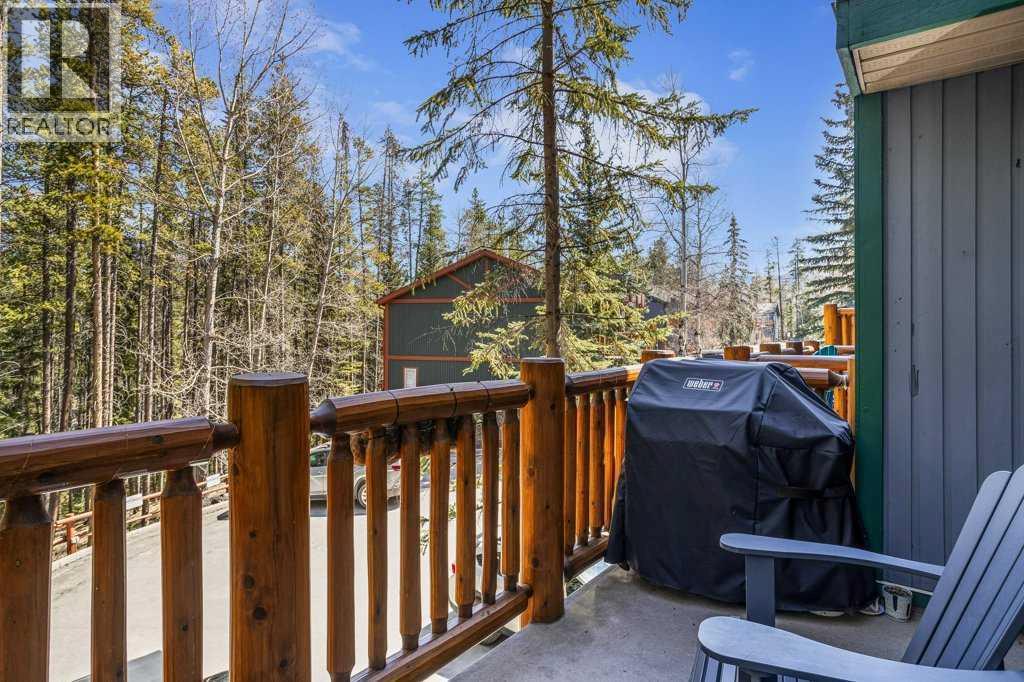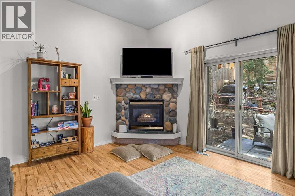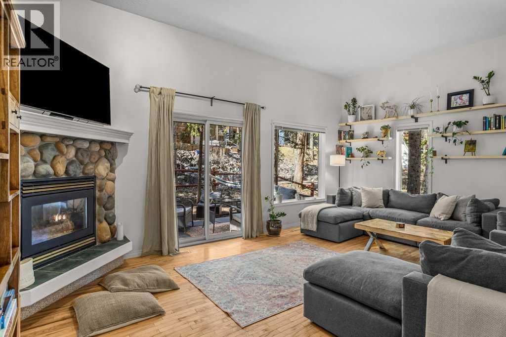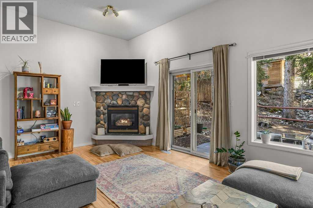 Situated in Rundle Mountain Estates, this well-maintained end-unit townhouse offers a serene forest setting and a quiet, private mountain retreat. With three bedrooms on the upper level and multiple living areas across three levels, the layout is ideal for families or a weekend escape. The bright, open-concept main floor features a functional kitchen, spacious dining area, and inviting living room with a cozy gas fireplace, while large windows bring in natural light and views of the surrounding trees. A two-piece bathroom completes this level. Upstairs, the primary suite includes a walk-in closet, ensuite, and private balcony, alongside two additional bedrooms and a full bath. The lower level provides flexible space for a family room, media area, or extra bedroom, plus laundry and storage. Complete with multiple outdoor spaces, an oversized single garage, and close proximity to Quarry Lake, the Nordic Centre, and downtown amenities. (id:6769)