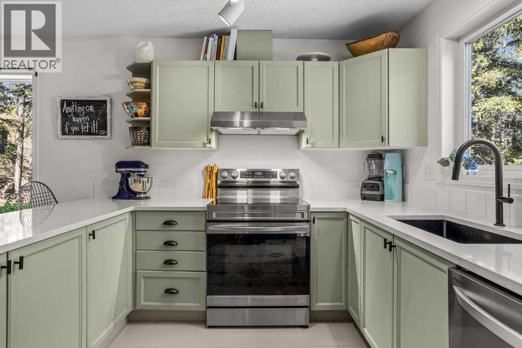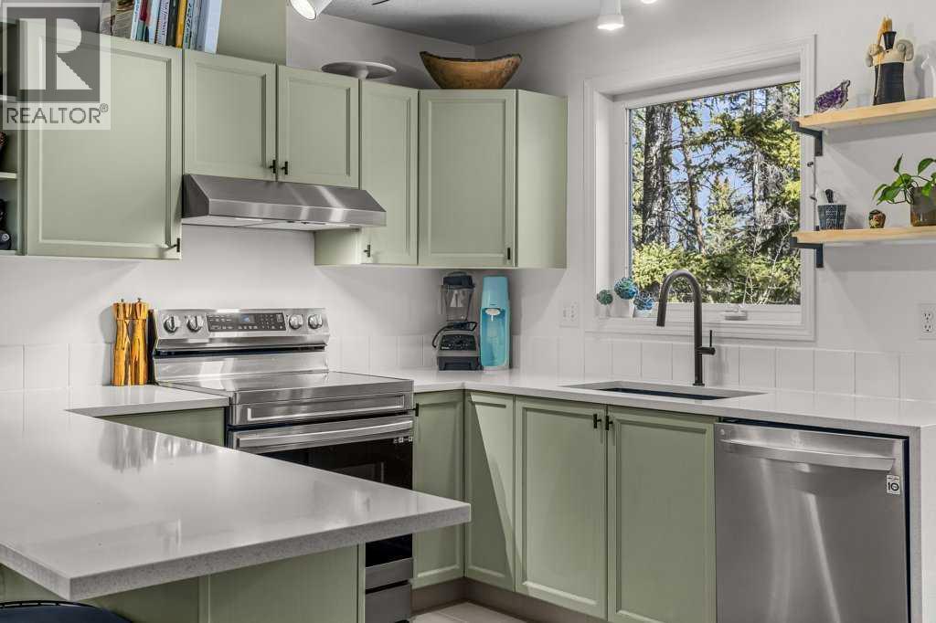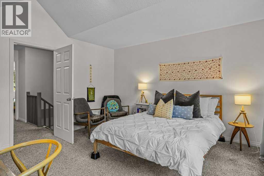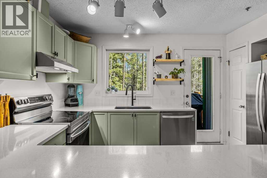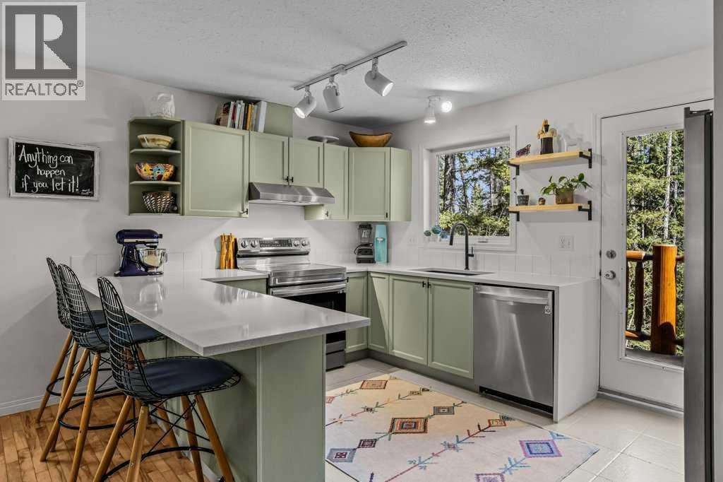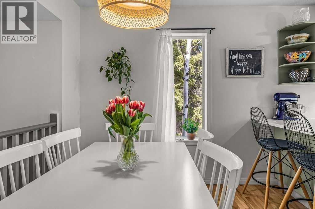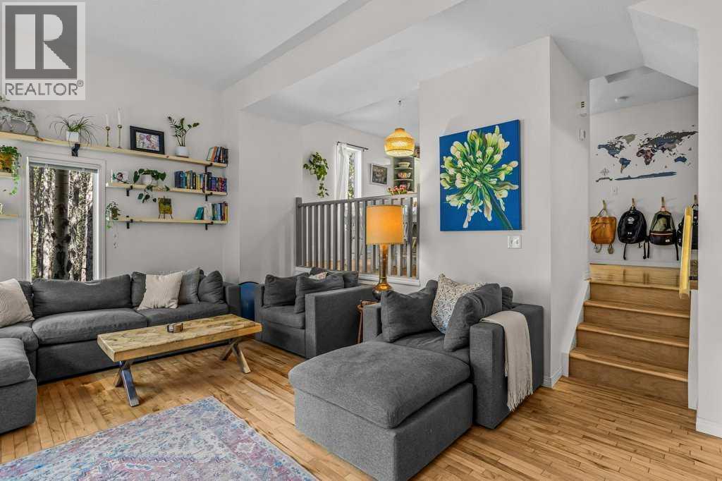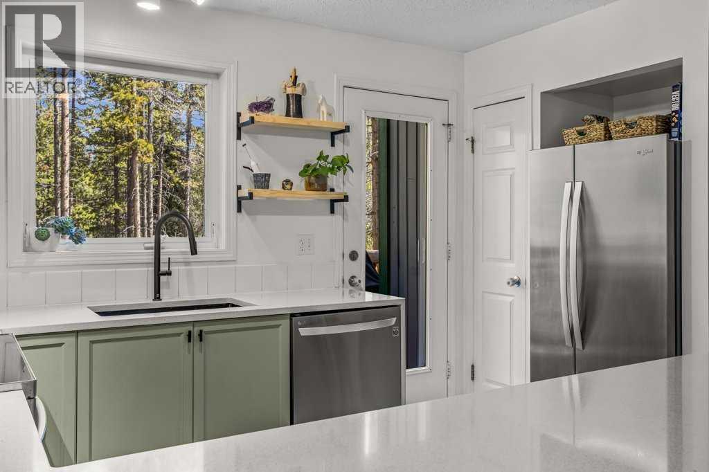 Situated in Rundle Mountain Estates, this well-maintained end-unit townhouse offers a serene forest setting and a quiet, private mountain retreat. With three bedrooms on the upper level and multiple living areas across three levels, the layout is ideal for families or a weekend escape. The bright, open-concept main floor features a functional kitchen, spacious dining area, and inviting living room with a cozy gas fireplace, while large windows bring in natural light and views of the surrounding trees. A two-piece bathroom completes this level. Upstairs, the primary suite includes a walk-in closet, ensuite, and private balcony, alongside two additional bedrooms and a full bath. The lower level provides flexible space for a family room, media area, or extra bedroom, plus laundry and storage. Complete with multiple outdoor spaces, an oversized single garage, and close proximity to Quarry Lake, the Nordic Centre, and downtown amenities. (id:6769)