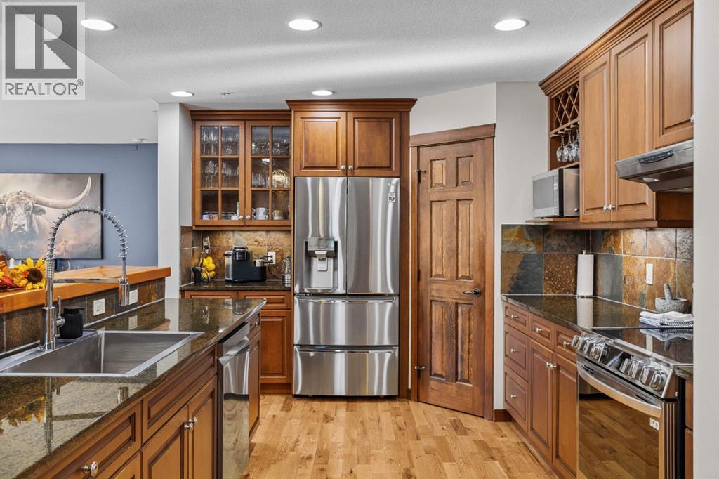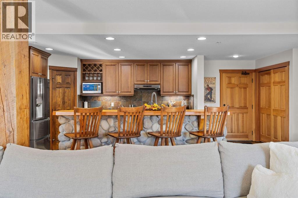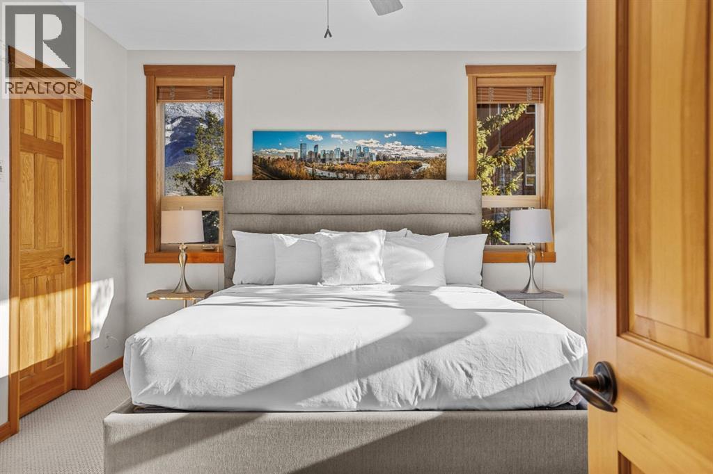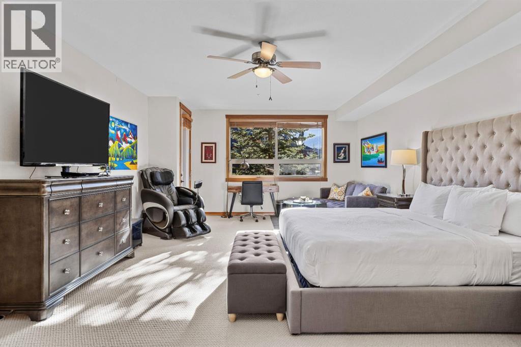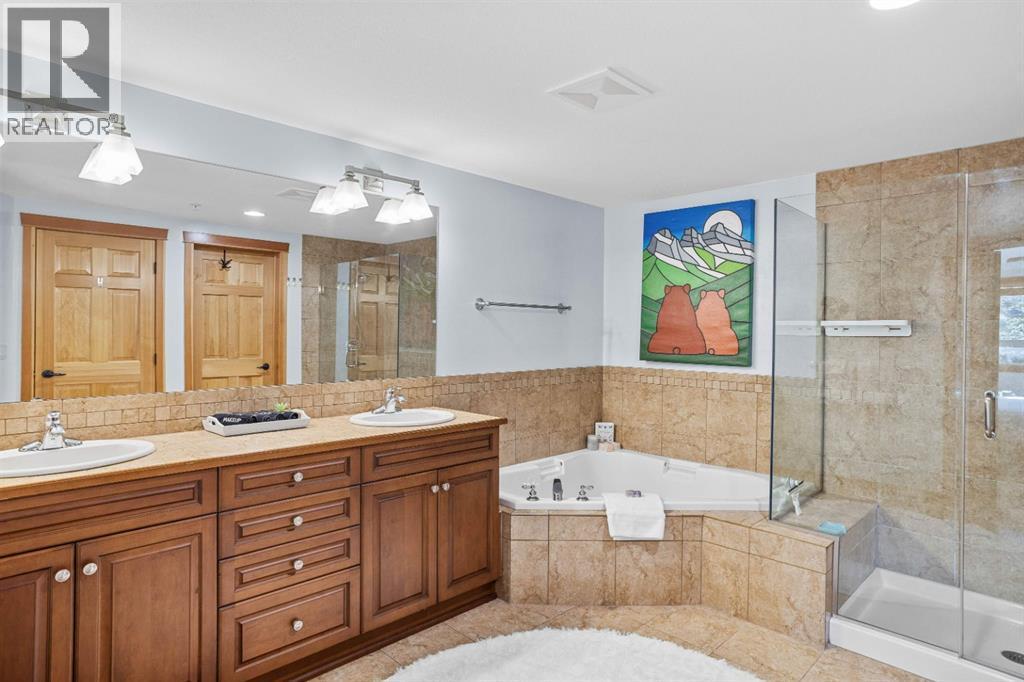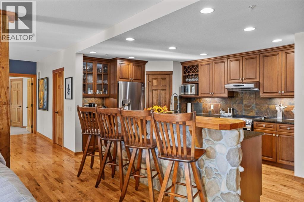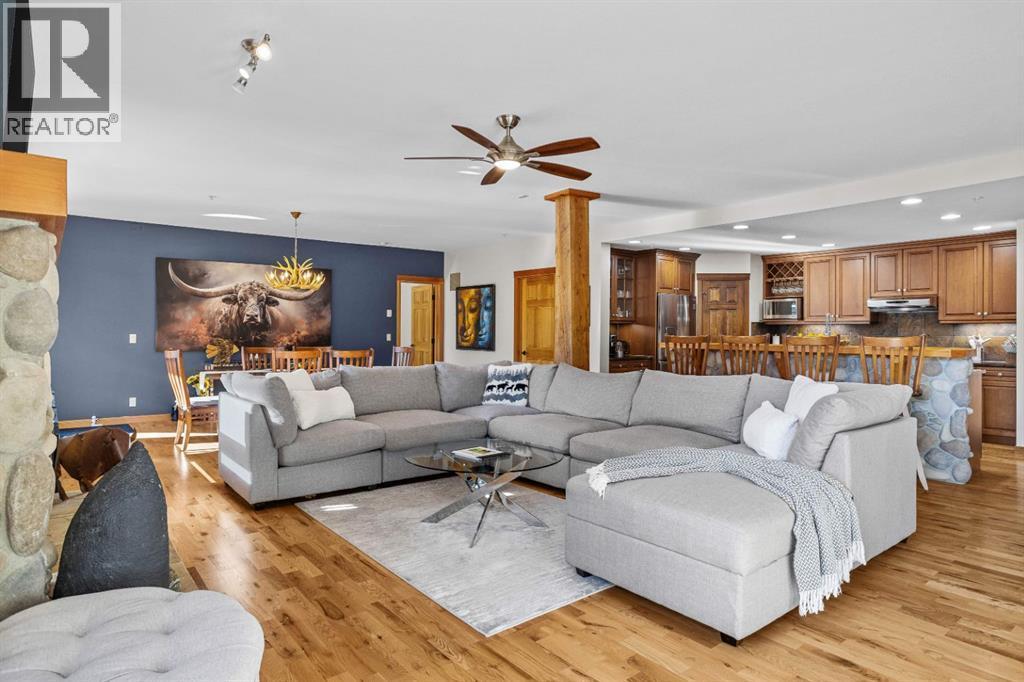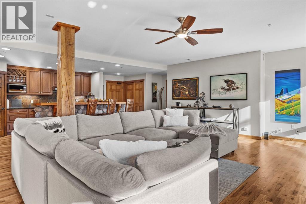 Experience the very best of mountain living at this stunning 3-bedroom, 3-bathroom, single level condo in Trailside Lodges. Spanning over 2000SF, this property offers breathtaking, Southeast-facing mountain views, an abundance of natural light, and a seamless blend of comfort and style. You feel the warmth and spaciousness here from the moment you step inside this beautiful open-concept living area, with floor-to-ceiling stone fireplace and beautiful hardwood flooring. The gourmet kitchen features high-end finishes, generous counter space, and lots of cupboards, ideal for culinary enthusiasts. The primary suite is a fabulous private retreat with space for a lounge area, direct deck access, and a large ensuite with a corner jetted tub, double vanity, spacious shower, water closet and walk-in closet. A second master suite also boasts direct deck access, a walk-in closet, and another elegant ensuite with double vanities. The third bedroom, tucked away for privacy, enjoys its own unique mountain views with a third full bathroom nearby. An oversized laundry room with additional flex space add to the home’s thoughtful design and offer tons of storage room. Enjoy outdoor living year-round on the impressive 35' x 9' partially covered deck, complete with a roll-down sunshade and patio heater, providing a comfortable space to take in the incredible mountain vistas. A number of recent upgrades have been completed, including new appliances, new kitchen sink/faucet, new toilets, & a murphy bed. Ownership at Trailside Lodges includes access to one of the best-outfitted clubhouses in Canmore, with hands down, the best outdoor hot tub with unbelievable panoramic views, an indoor resistance pool, a well-equipped fitness center, billiards & games loft, and a theatre room. Additional conveniences include a heated underground parking stall, storage for all your seasonal gear, and ample guest parking. This home is move-in ready and offers the perfect lock-and-leave lifestyle without c ompromising space or luxury. (id:6769)